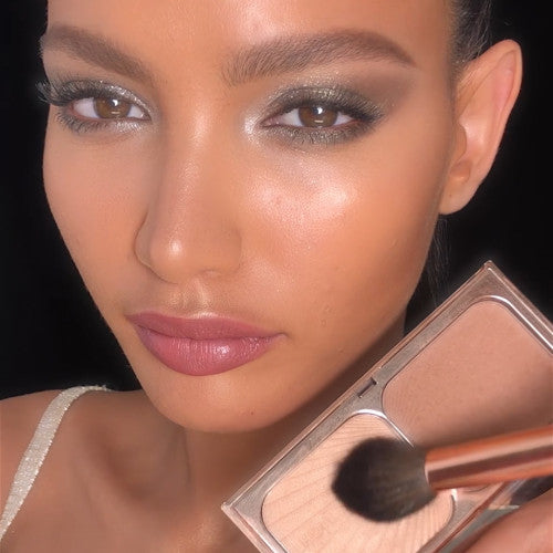 My iconic FILMSTAR BRONZE & GLOW has two sides, a contour and highlight. The contour has a blend of pearl and pigments to help contour your face whilst bronzing, mimicking sun-kissed skin. The highlighter has a golden base to universally flatter any skin tone, with Light Flex Technology to capture and reflect light just where you want it. Encased in Hollywood inspired art-deco packaging for the ultimate makeup accessory.