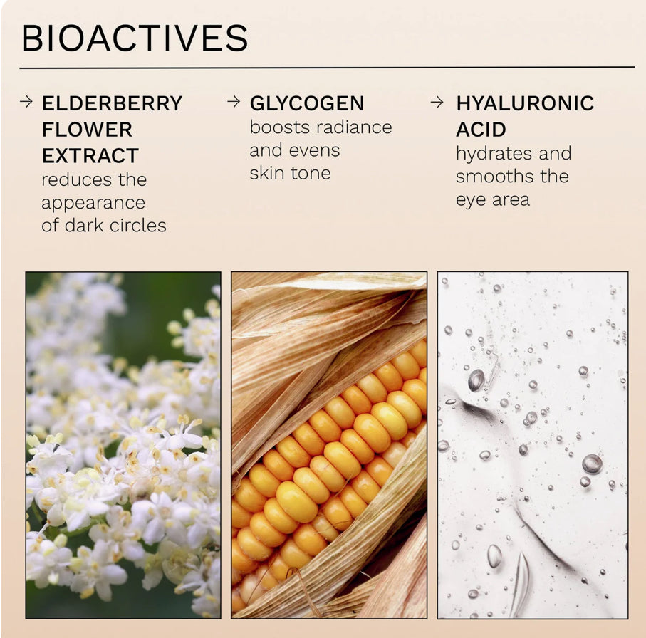 Designed to limit irritation, the 95% naturally derived formula absorbs easily into the delicate eye area to help neutralize dark circle and puffiness-triggering free radicals, keeping your eyes plumped, smoother and brighter-looking throughout the day. With antioxidant rich Elderberry Flower Extract upcycled from the French perfume industry and moisture-locking Glycogen from corn.